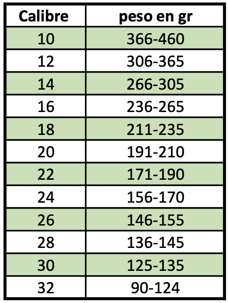 Esta clasificación permite optimizar la logística, la presentación comercial y la adaptación a los distintos canales de distribución. Los calibres disponibles abarcan desde frutos de mayor tamaño hasta calibres más pequeños, ofreciendo soluciones adaptadas a las necesidades de mayoristas, distribuidores y cadenas de retail.