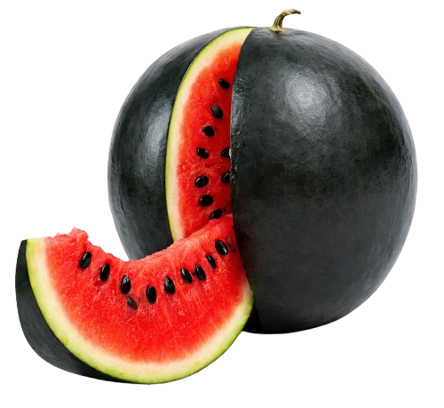 La sandía negra con semillas se caracteriza por su forma redonda y uniforme y por su piel de color verde muy oscuro. Presenta una corteza resistente y una carne de color rojo intenso, con una textura jugosa y refrescante.